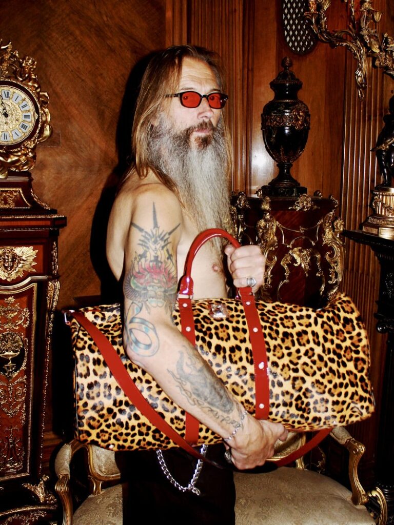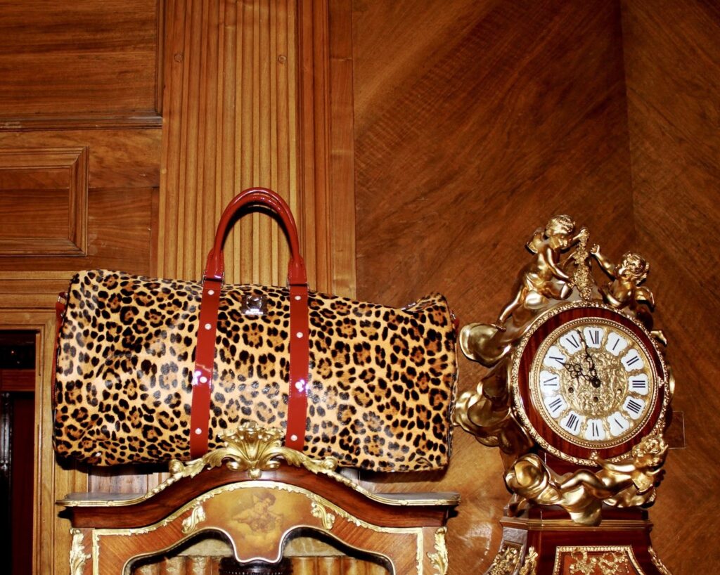With this piece we have a very structural and symmetrical design. Now look at the red patent, leopard and the hardware leather I use. The piece shows exactly how I like to use structure and boldness in the design. The structure is a very classic duffle bag that I elongated. Usually they are 45 cm but this is 60 cm so that’s a long weekend of three or four days without making the height any taller.